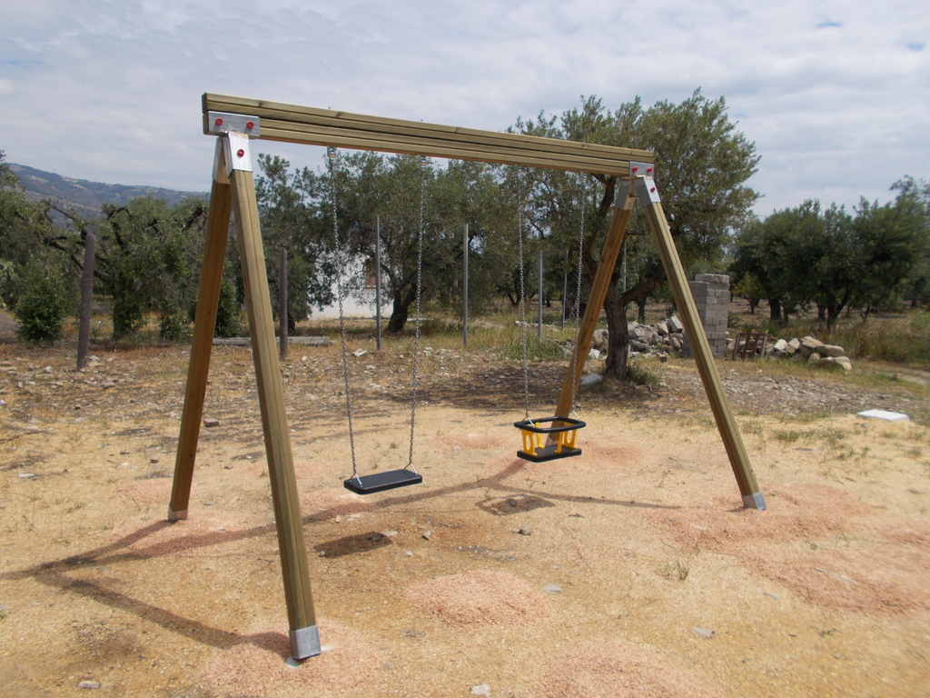 Struttura gioco in legno di pino di Svezia con certificazione PEFC/02-34-51, trattato in autoclave tramite processo "vuoto pressione" con sali preservanti atossici (a norma per l'utilizzo dei giocattoli).Composto da pilastri laterali di sostegno 255x9,4x9,4 cm e una trave superiore 353x9,4x18,8 cm.