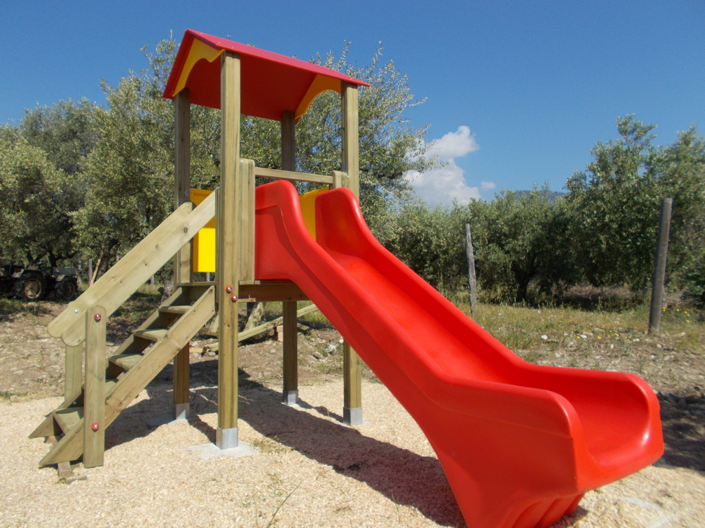 - N. 1 scivolo in polietilene di altezza 97 cm, disponibile in vari colori (giallo-rosso-blu), realizzato con sistema rotazionale tubolare certificato TUV;