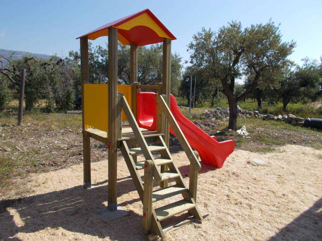 Composto da una torretta con tetto a due falde e balaustre di protezione in compensato marino verniciati con smalto acrilico ad acqua, uno scivolo in polietilene di altezza 97 cm, disponibile in vari colori (giallo-rosso-blu), realizzato con sistema rotazionale tubolare certificato TUV.